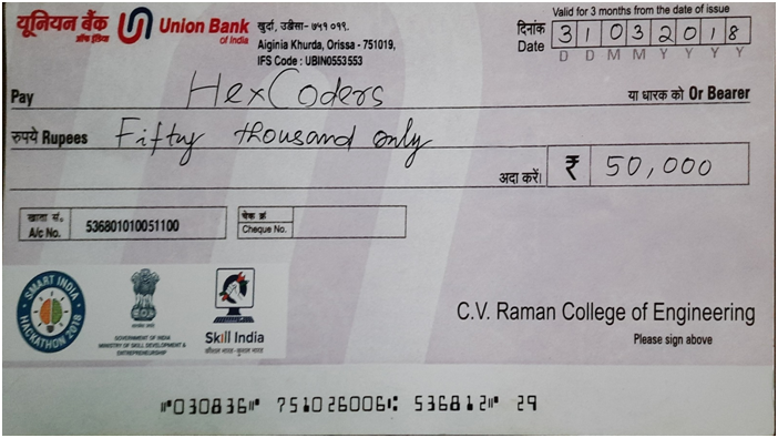 Manish Parajapati, Vatsal Dharek, Jeet Ardeshna, Chetan Majithia, Bhumi Garach, and Mo. Ayaz Arbi received a prize money of Rs. 50,000/- in “Smart India Hackathon – 2018” at C V Raman College of Engineering, Bhubaneshwar.